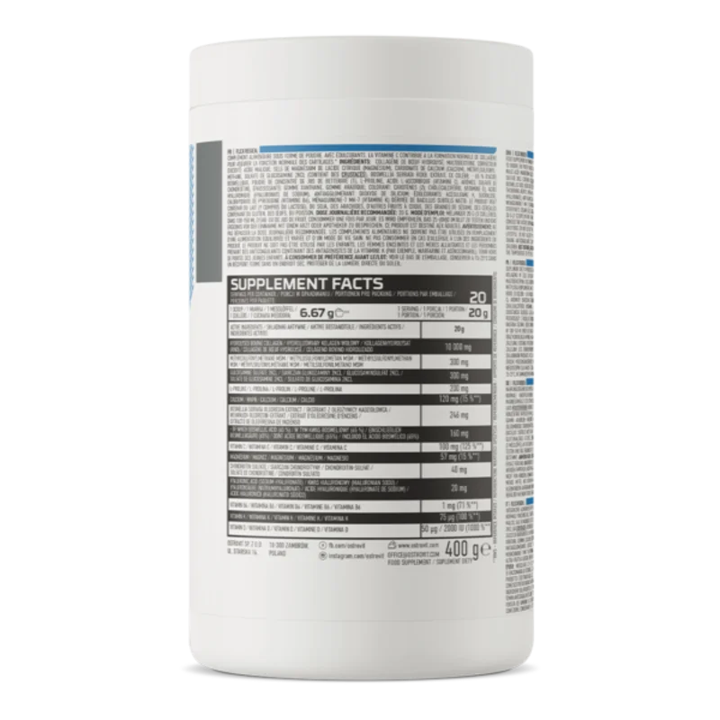 OstroVit Flex Regen is a comprehensive dietary supplement that is a source of valuable ingredients – the preparation contains, among others, collagen, glucosamine, calcium or vitamin C. It is a product with a unique, peach-pear flavor, available in powder form, which has been created for people who want to supplement their daily diet with valuable ingredients.