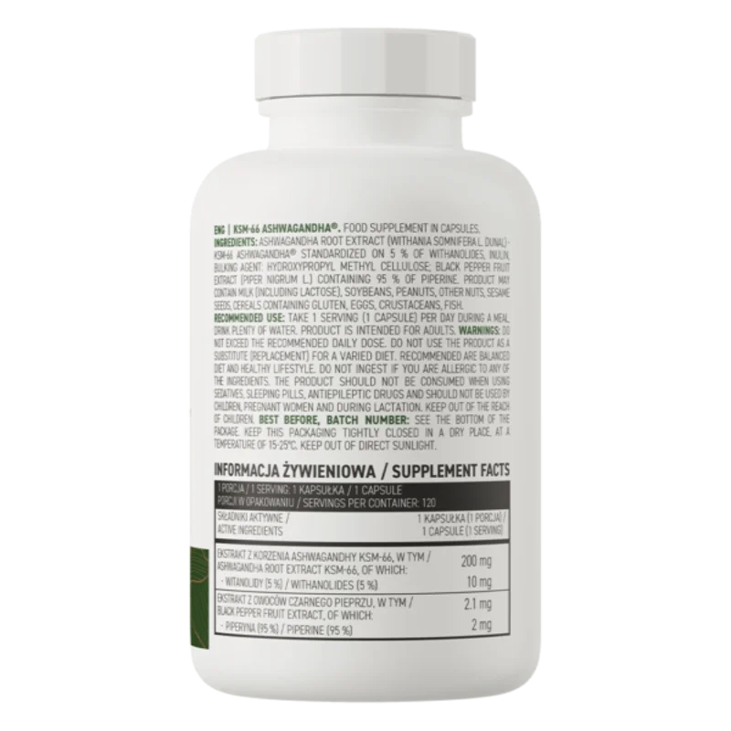 Ashwagandha root extract (Withania somnifera L. Dunal) – KSM-66 Ashwagandha® standardized on 5% of withanolides, inulin, bulking agent: hydroxypropyl methyl cellulose; black pepper fruit extract (Piper nigrum L.) containing 95% of piperine.