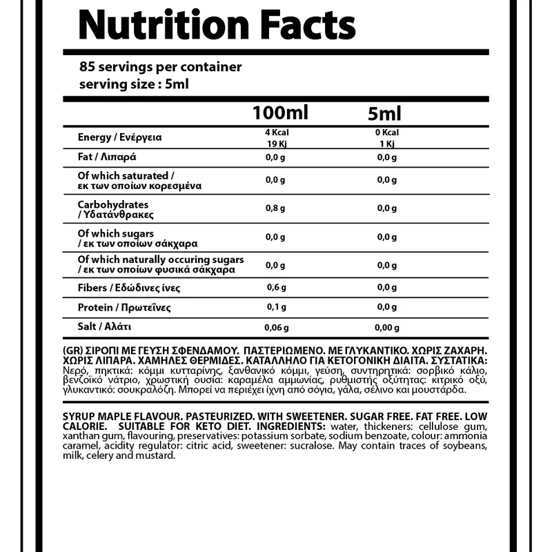 NUTRIYUMMY 0% SYRUP MAPLE 425ML is a delicious and healthy addition to your meals, perfect for those who love the warm, spiced flavor of speculoos cookies but want to avoid the excess sugar and fat. With zero sugar and fat, this syrup is ideal for people looking to reduce their caloric intake while still indulging in sweet treats. At only 3 calories per 100 mL, it’s an excellent option for those on keto, low-carb, or calorie-conscious diets. The syrup offers a guilt-free way to enhance your favorite breakfasts, snacks, or desserts without compromising on flavor. Whether you’re drizzling it over pancakes, mixing it into yogurt, or using it as a topping for your favorite dessert, NUTRIYUMMY 0% Speculoos Syrup gives you the comforting taste of cinnamon cookies without the heavy caloric load of traditional syrups.