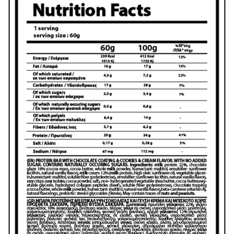 The NUTRIYUMMY BARPRO COOKIES & CREAM 60G protein bar is an excellent protein snack that combines great taste with nutritional value. With a chocolate coating and Cookies & Cream flavor, high protein and fiber content, no added sugar, and no palm oil, it is the ideal choice for those looking for a delicious and healthy treat.