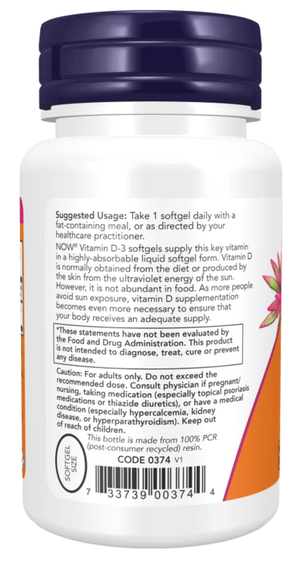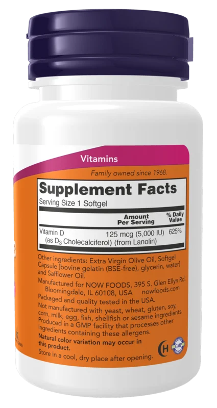 NOW® Vitamin D-3 softgels supply this key vitamin in a highly-absorbable liquid softgel form. Vitamin D is normally obtained from the diet or produced by the skin from the ultraviolet energy of the sun. However, it is not abundant in food. As more people avoid sun exposure, vitamin D supplementation becomes even more necessary to ensure that your body receives an adequate supply.